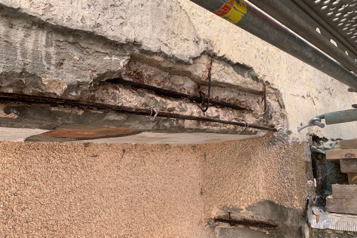 Como consecuencia de la carbonatación y la presencia de cloruros procedentes del ambiente marino, las armaduras de acero habían iniciado un proceso de oxidación. La corrosión provoca un aumento de volumen del acero que genera tensiones internas, fisuras y eventual desprendimiento del recubrimiento de hormigón, comprometiendo tanto la seguridad estructural como la estética del edificio.